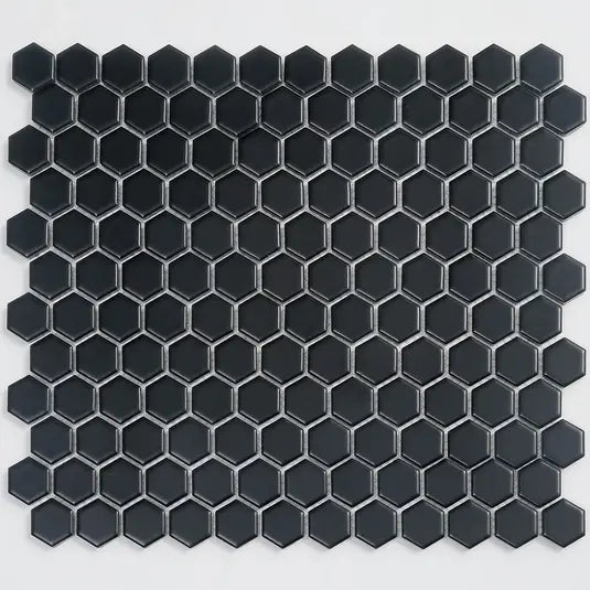 This beautiful Black Matte. Hexagon Mosaic Tile is the perfect solution for both classic and modern backsplash tile needs. The matte hexagons draw your eyes and create interest for a truly unique accent for your space. The mesh backing makes this an easy-to-install option for your kitchen or bathroom, and you can even use this porcelain tile as a countertop or flooring in your home for the ultimate versatility and to tie your home’s design together.