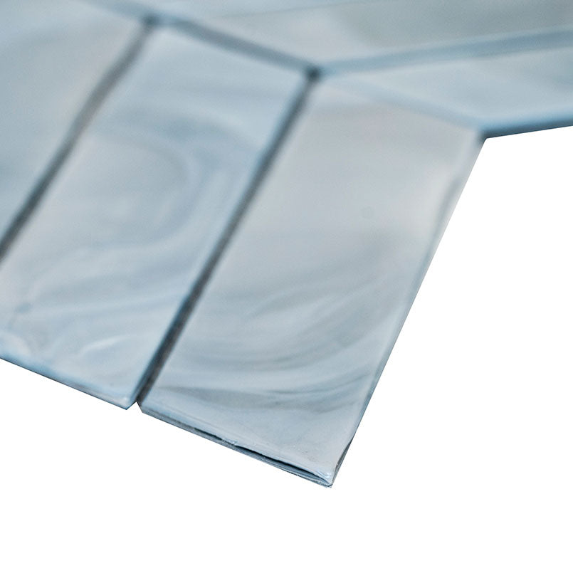 The Blue Shimmer Chevron Pattern Tile marries artistic style with versatility in this gorgeous blue tone mosaic backsplash tile. The mesh backing makes it simple to install and keeps everything lined up perfectly for that flawless look in your kitchen or bathroom. This glass tile can be used in both residential and commercial spaces on walls and countertops for a beautiful statement piece that will draw attention and give your space more interest.