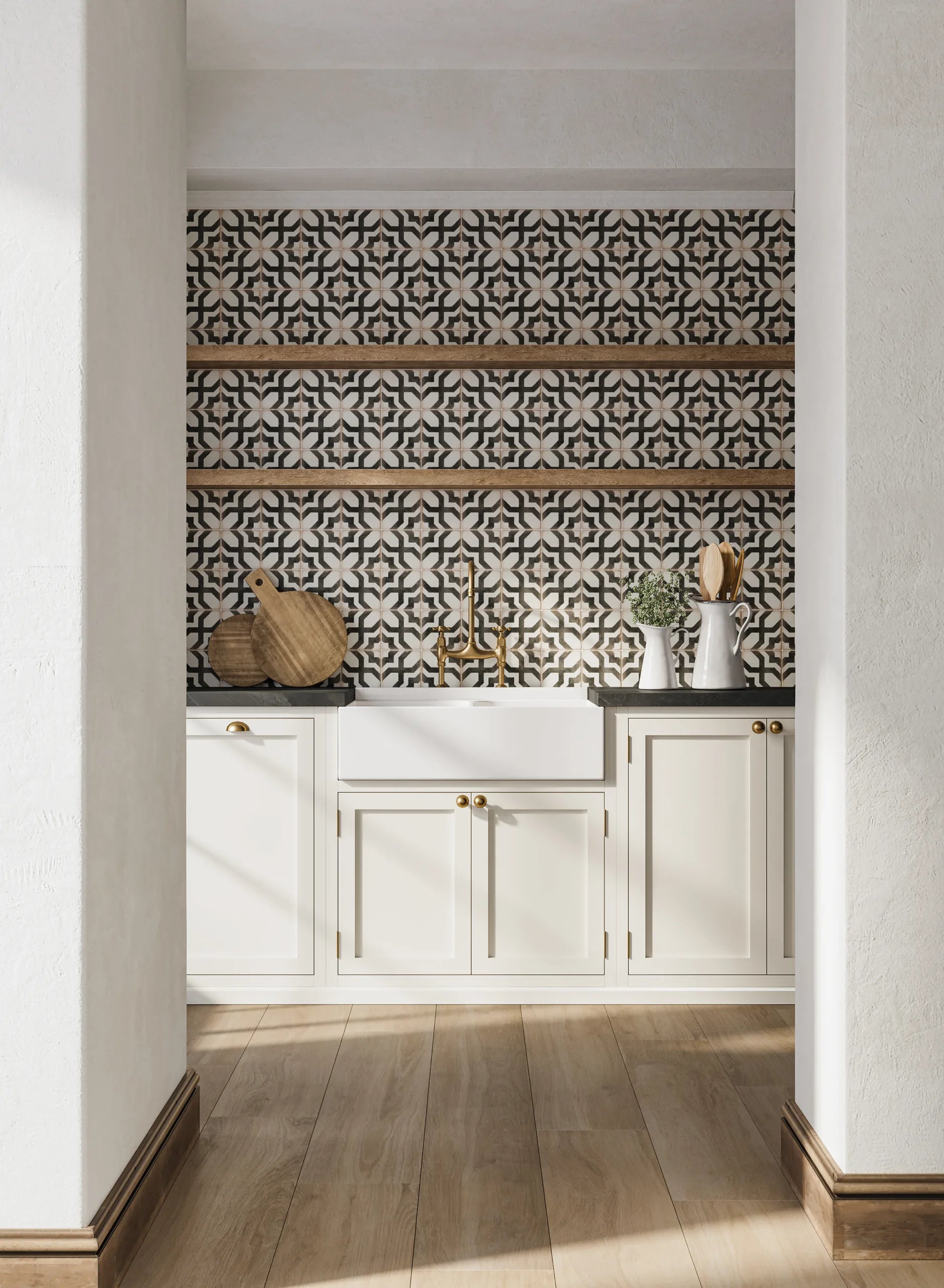 Update your space with The Casablanca Collection, a series of decorative glazed ceramic tiles designed to offer an encaustic, hand-crafted look. Inspired by the exquisite medallions and motifs found within North-African ceramics, this collection includes 10 fresh patterns and a rustic, white option. Each pattern is offered in 5” x 5” Field Tile and 1/2” x 5” Jolly Liner Trim. Mix and match decorative patterns and colors to design a warm, inviting space unique to you. Suitable for use on both interior walls or floors. The Casablanca Collection is made in Spain.