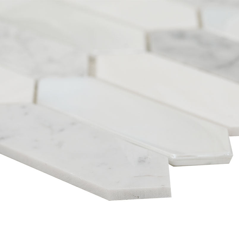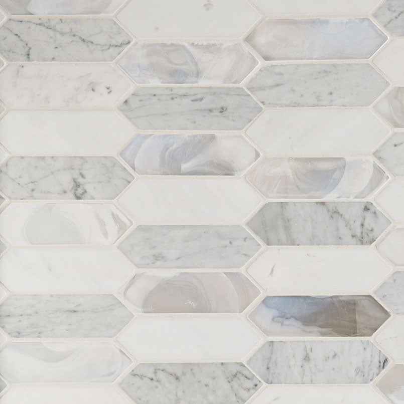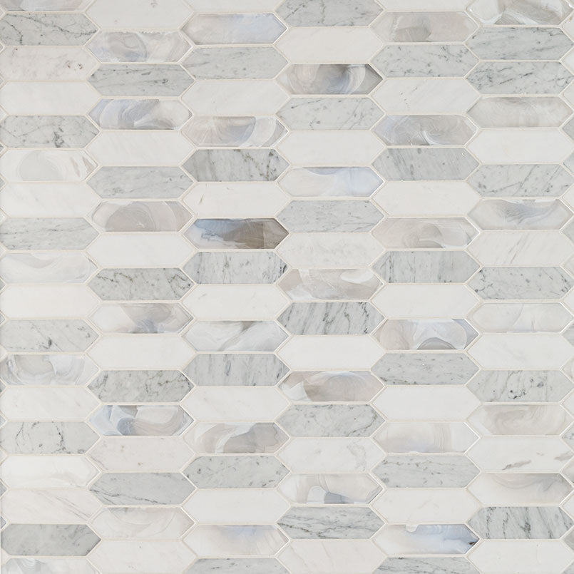 xCienega Picket tile features an artistic mix of soothing blue, gray, and cream tones in a charming elongated hex pattern. This marble and glass blend tile is an ideal choice for a wide variety of applications including backsplash,vanity walls, shower surrounds, and more in residential and light commercial settings. Whether run vertically or horizontally, it is sure to add interest and sophistication to your space. This tile is Greenguard Indoor Air Quality Certified® and comes mounted on mesh-backed sheets for a simplified installation and professional finish.