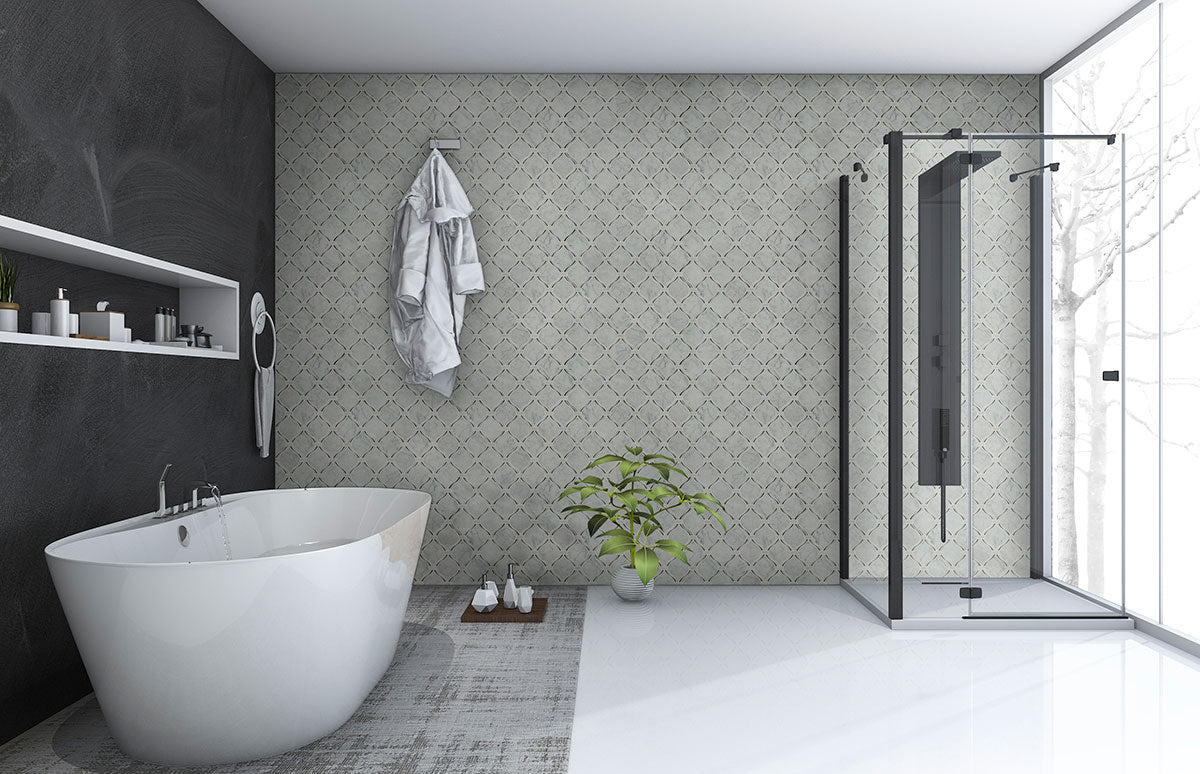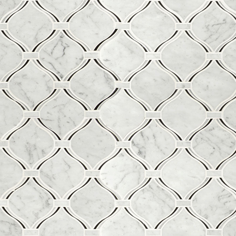 Danza Arabesque Tile offers a contemporary take on the classic glass arabesque tile. With a sophisticated combination of white-gray marble tiles outlined in darker marble, the Moroccan tile backsplash is perfect for kitchens, bathrooms, laundry rooms, or mudrooms, and it can also be used as a feature wall or shower surround. With its neutral color and delicate design, Danza Arabesque complements a wide variety of color schemes and decorative choices. This arabesque tile backsplash is Greenguard Indoor Air Quality Certified® and comes mounted on mesh-backed sheets for simplified installation and a professional finish.