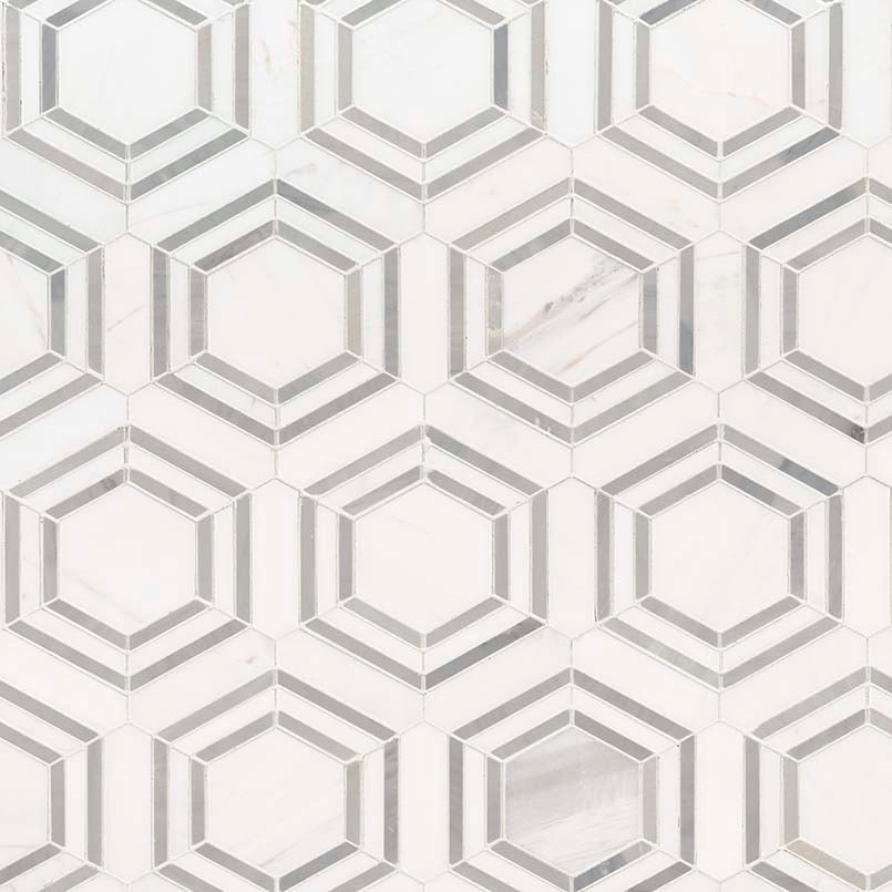 Georama Grigio Marble Tile is gray and white geometric tiles made of luxurious marble in hexagonal shapes. The contemporary design of this backsplash tile can be featured as kitchen or bathroom countertops, while the geometric floor tiles and patterened wall tiles will add interest to any interior.