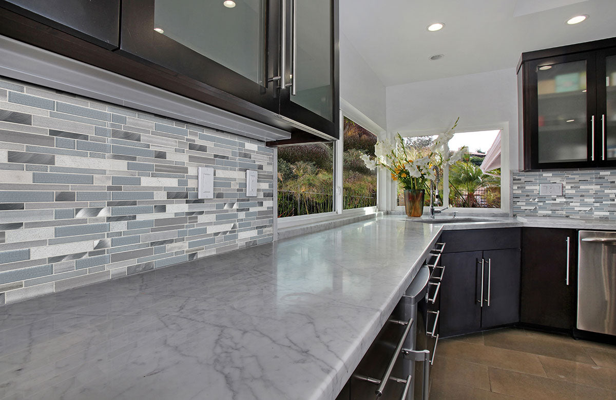 Harlow Interlocking Tile features a striking combination of icy grays and silvery tones made from a stunning combination of glass, natural stone, and metal. These tiles are recommended to use as backsplash tile, and for accent walls as well as for countertops. Create a breath-taking shower surround, kitchen backsplash, or accent wall around a fireplace. They coordinate beautifully with a wide range of tiles and natural stone slabs in our vast inventory.