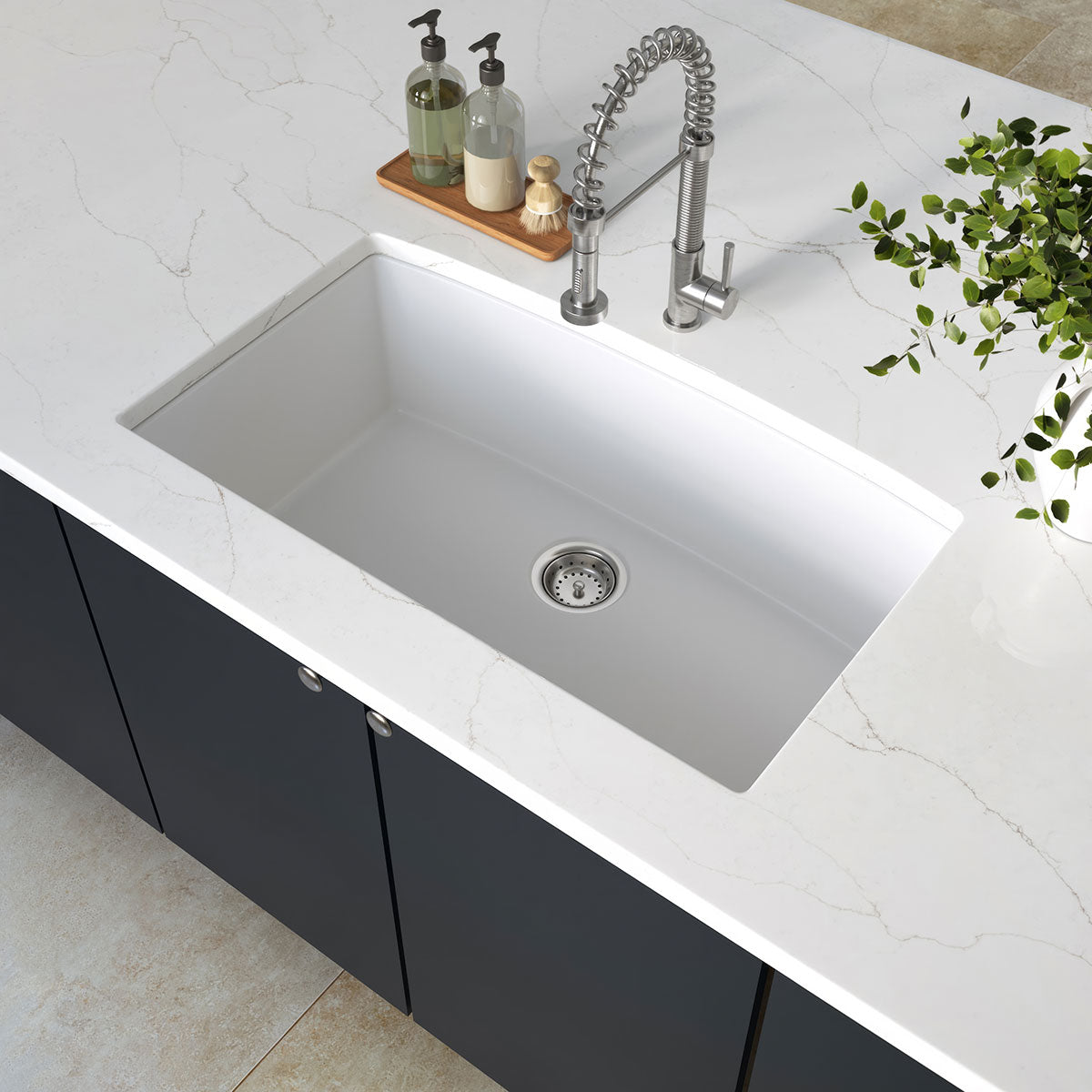 This beautiful white quartz single bowl undermount sink is scratch, stain, and germ resistant. With one generous 9” deep basin, it easily accommodates your large cookware and stacks of dishes. An ideal choice for busy homes and light commercial environments, this quartz sink is designed to be heat resistant up to 535 degrees Fahrenheit and its thick construction provides superior sound absorption. Its upscale velvety smooth matte finish helps minimize water spots and it features a UV protected surface to help resist fading. Long lasting quality and elegance come together in this popular single bowl quartz sink. Backed by a limited lifetime warranty.