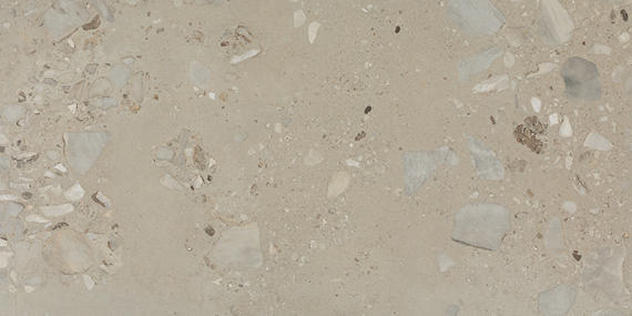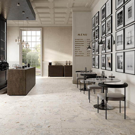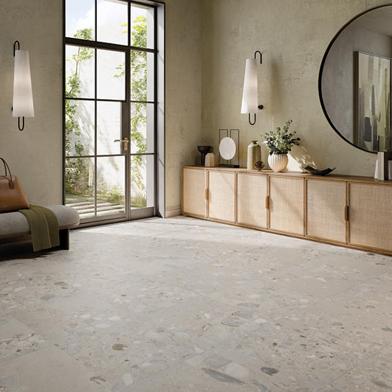 of natural terrazzo meets the durability of porcelain tile. This stunning series
